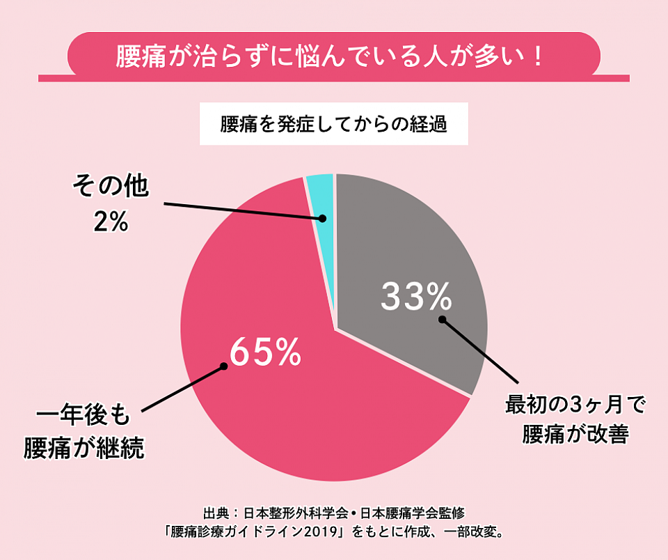 現在の日本では約4000万人が原因不明の腰痛に悩んでいます。腰痛は発症から1年経っても60%以上が慢性化すると言われていますが、発症から3ヶ月以内に改善する方は約33%と少なく、「最初の3ヶ月」が腰痛改善の重要なチャンスです。(上のグラフもご参照ください)